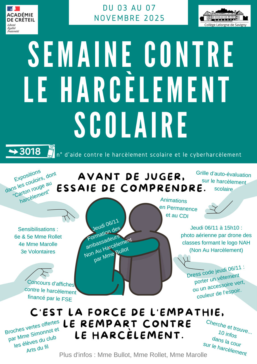 Durant une semaine, du 3 au 7 novembre 2025, le Collège Lelorgne de Savigny s’est pleinement engagé dans la Semaine nationale de lutte contre le harcèlement et le cyberharcèlement. Tout au long de cette période, élèves et personnels ont été sensibilisés à travers des expositions, des temps d’échanges, des animations au CDI et en permanence, ainsi que la formation des ambassadeurs « Non au Harcèlement ».